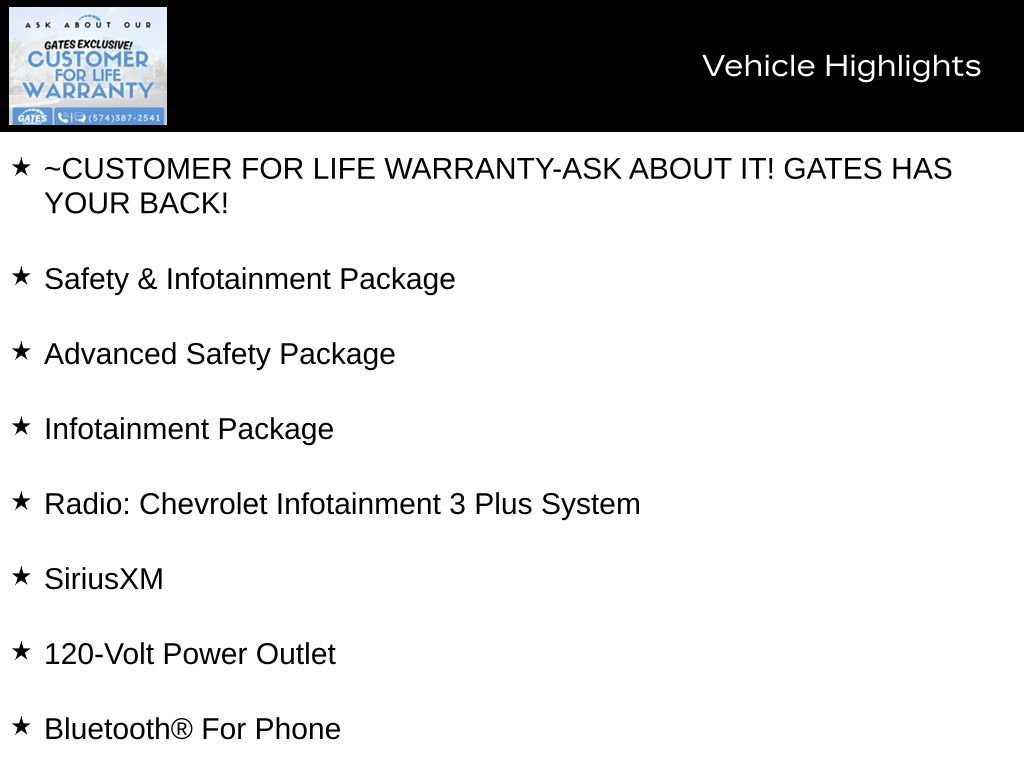 Step inside and be captivated by the premium Cloth Seat Trim, 8-way power driver's seat, and heated front seats, ensuring your comfort is uncompromised. The Chevrolet Infotainment 3 Plus System with SiriusXM keeps you connected and entertained, while the advanced safety features, including Adaptive Cruise Control and HD Surround Vision, provide peace of mind on every journey.